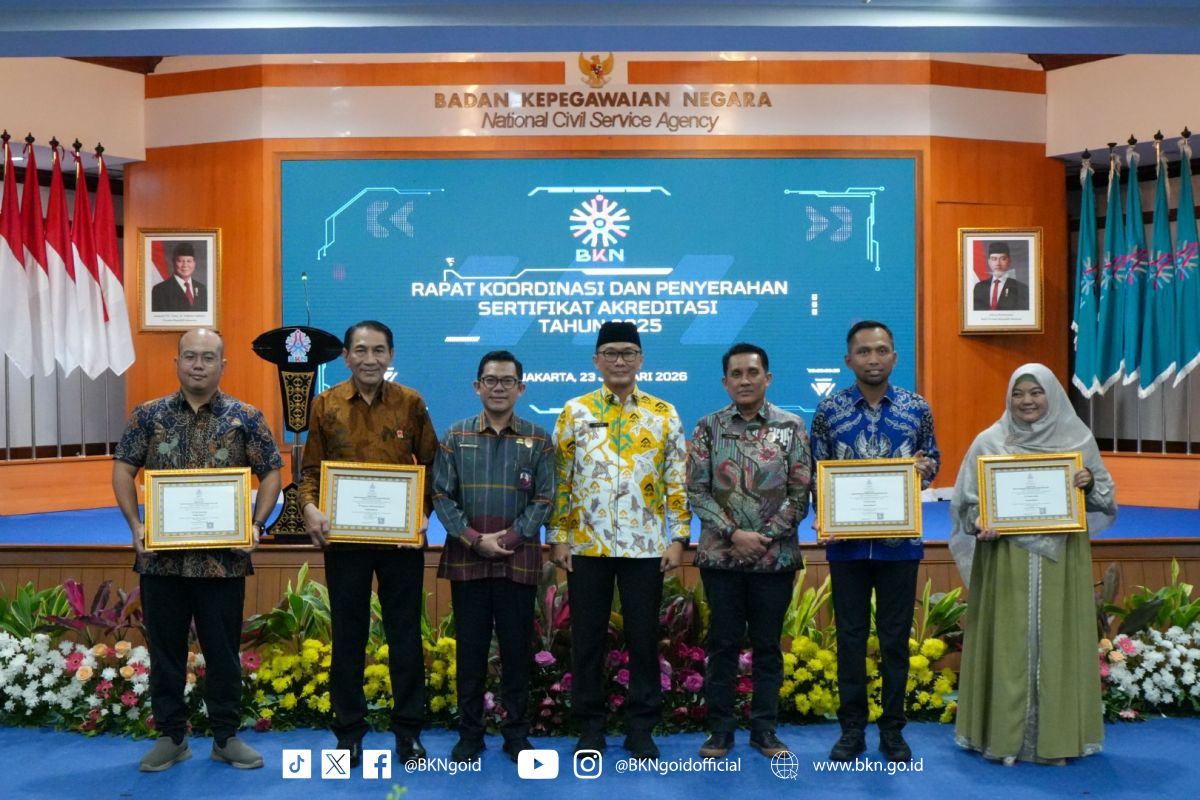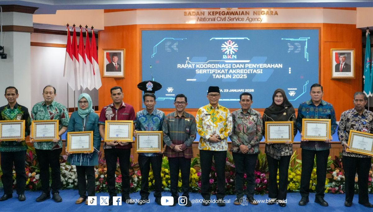 “Akreditasi BKN luar biasa untuk memberikan motivasi bagi kami. Instrumennya sangat _challenging_, tapi syukurlah kami bisa memenuhi semuanya. Ini adalah amanah dari negara melalui BKN,” ungkap Riyadi, saat penyerahan sertifikat akreditasi kepada 25 Lembaga Penilaian Kompetensi ASN, Jumat (23/01/2026) di BKN Pusat, Jakarta.