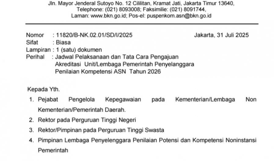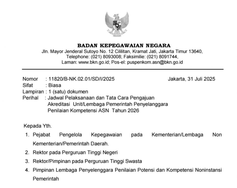 Sehubungan dengan diterbitkannya Surat Edaran Kepala Badan Kepegawaian Negara Nomor 4 Tahun 2025 tentang Pedoman Akreditasi Penyelenggaraan Penilaian Kompetensi Aparatur Sipil Negara, kami memberitahukan sebagaimana terlampir pada surat berikut:11820_B-NK.02.01_SD_I_2025-Revisi Surat Edaran Pemberitahuan Akreditasi 2026