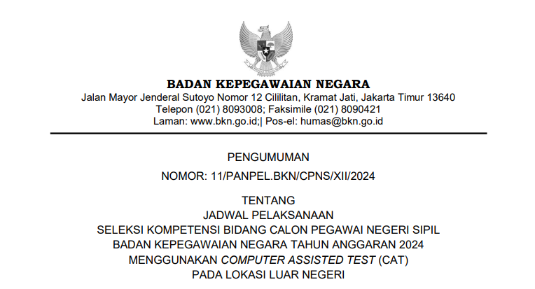 Merujuk Pengumuman Ketua Panitia Seleksi Pengadaan ASN Badan Kepegawaian Negara (BKN) Tahun Anggaran (T.A.) 2024 Nomor: 09/PANPEL.BKN/CPNS/XII/2024 tanggal 5 Desember 2024 tentang Jadwal Pelaksanaan Seleksi Kompetensi Bidang Calon Pegawai Negeri Sipil Badan Kepegawaian Negara Tahun Anggaran 2024 Menggunakan Computer Assisted Test (CAT) dan menindaklanjuti Surat Deputi Bidang Sistem Informasi dan Digitalisasi