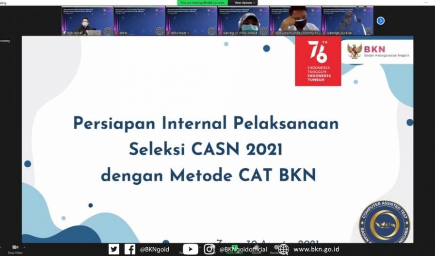 Jakarta – Humas BKN, Menjelang penyelenggaraan seleksi Kompetensi Dasar (SKD) CPNS tahun 2021, Plt Kepala Badan Kepegawaian Negara (BKN) Bima Haria Wibisana menekankan kepada pegawai BKN yang akan ditugaskan sebagai Tim Petugas CAT untuk menjaga integritas dan transparansi sistem CAT. “Sebagai petugas harus jujur, akuntabel, dan bertanggung jawab terhadap proses seleksi khususnya di Tilok. Jangan sampai ada penyalahgunaan sistem oleh siapa pun dan pihak mana pun,” terangnya dalam Rapat Koordinasi Arahan Pimpinan BKN untuk Persiapan Seleksi CASN 2021, Senin (30/8/2021) yang diikuti seluruh petugas CAT BKN.