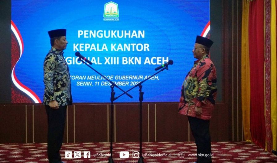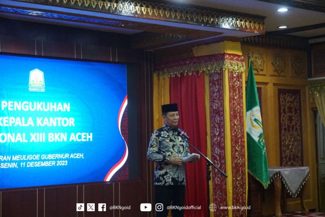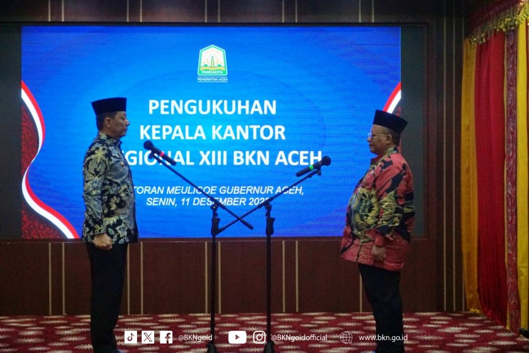 Aceh – Humas BKN, Joko Subakti yang sebelumnya menjabat sebagai Kepala Pusat Pengkajian Manajemen ASN BKN resmi menerima pengukuhan sebagai Kepala Kantor Regional (Kanreg) XIII BKN Banda Aceh. Pengukuhan dilakukan oleh Penjabat (Pj) Gubernur Aceh Achmad Marzuki, Senin (11/12/2023) di Banda Aceh.