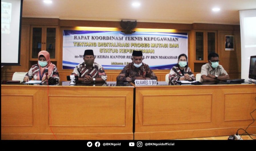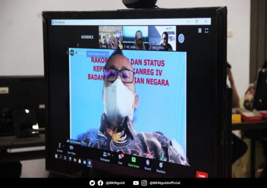 Makassar – Humas BKN, Deputi Bidang Mutasi Kepegawaian BKN, Aris Windiyanto menyebutkan bahwa digitalisasi proses pelayanan kepegawaian BKN akan terus berjalan dan semakin berkembang. Menurutnya pelayanan Kepegawaian khususnya di bidang mutasi akan selalu berinovasi, apalagi dimasa pandemi sekarang. “Kedeputian Mutasi bersama Kedeputian Sinka selalu membuat terobosan sehingga pelayanan kepegawaian menjadi lebih cepat dan yang pasti seluruh proses pelayanan dilakukan secara digital dan lesspaper,” imbuhnya dalam Rapat Koordinasi Teknis (Rakornis), Senin (08/2/2021) yang diselenggarakan Kantor Regional IV (Kanreg IV) BKN guna percepatan pelayanan kepegawaian dan digitalisasi proses mutasi dan status kepegawaian dan diikuti seluruh BKD/BKPP/BKPSDA/BKPSDM instansi daerah dan vertikal di wilayah kerja Kanreg IV BKN melalui video conference.