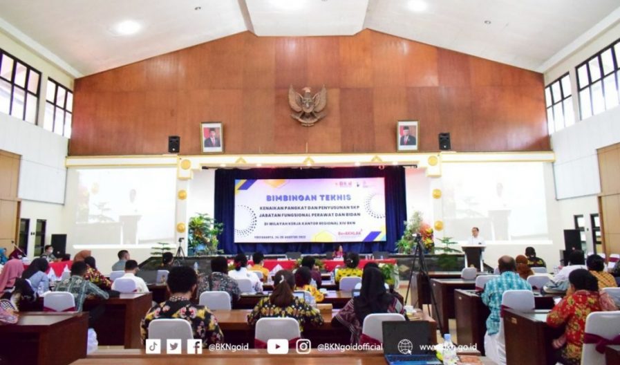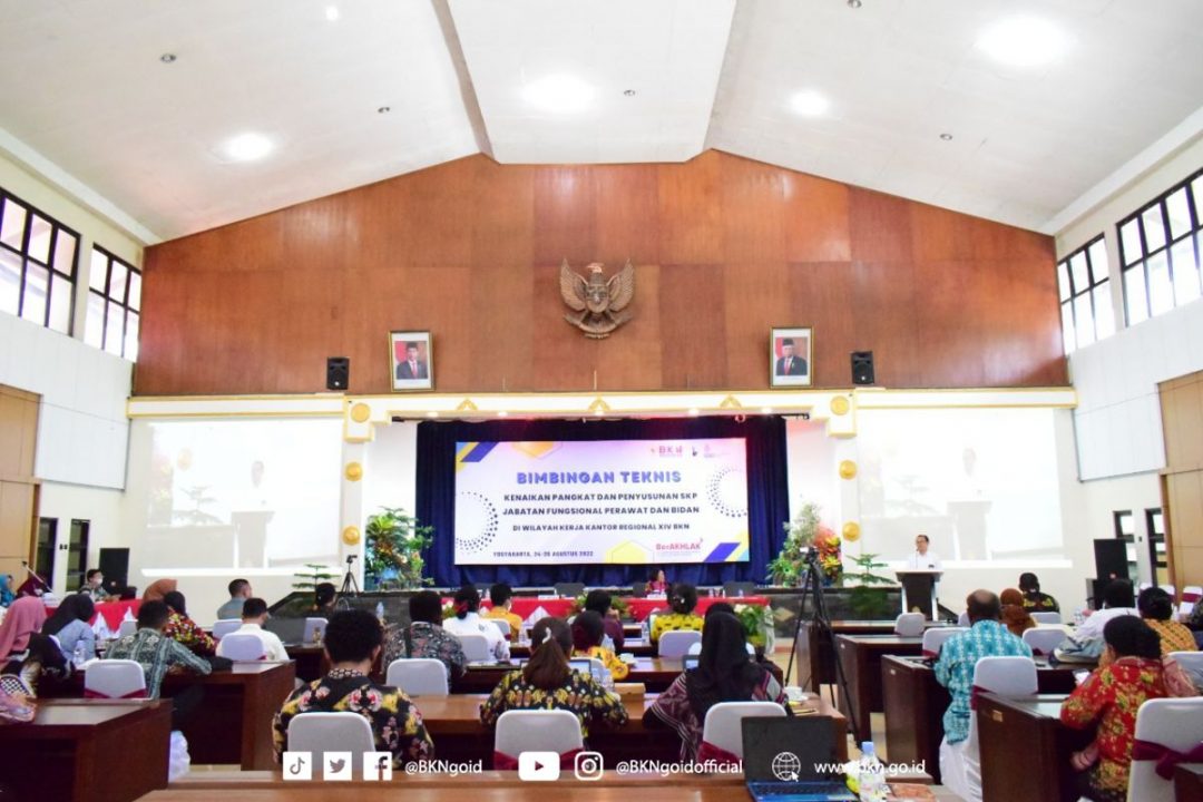 Yogyakarta-Humas BKN, Melanjutkan kegiatan Bimbingan Teknis (Bimtek) Penyusunan SKP Jabatan Fungsional Guru yang telah berlangsung pada  22 s.d 24 Agustus 2022, Kantor Regional XIV BKN Manokwari kembali menyelenggarakan Kegiatan Bimbingan Teknis (Bimtek) Penyusunan SKP Jabatan Fungsional (JF) Perawat dan Bidan yang dilaksanakan di Aula Sasono Panggih Utomo Kantor Regional I BKN Yogyakarta. Acara ini dilaksanakan tanggal 24 s.d 26 Agustus 2022 dan diikuti oleh peserta pengelola kepegawaian pada BKD/BKPP/BKPSDM, Dinas Kesehatan dan RSUD dari setiap Provinsi/Kabupaten/Kota diwilayah kerja Kantor Regional XIV BKN.