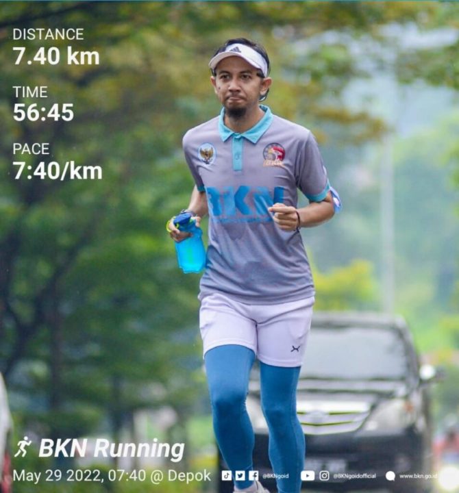Jakarta – Humas BKN, 30 Mei 2022, Badan Kepegawaian Negara (BKN) genap berusia 74 Tahun. Perayaan Hari Ulang Tahun (HUT) yang ke-74 ini mengangkat tema “Bangkit, Berkinerja, Bersama”. Dengan semangat tema tersebut, ada yang menarik dari perayaan HUT tahun ini. Farhan Abdi Utama, Pegawai Negeri Sipil (PNS) di lingkungan BKN Pusat, merayakan usia ke-74 BKN dengan berlari sejauh 7.4 kilometer. Tidak hanya itu, Farhan juga berlari dengan pace 7:40 menit/kilometer, dan memulai start pada pukul 07.40 WIB.