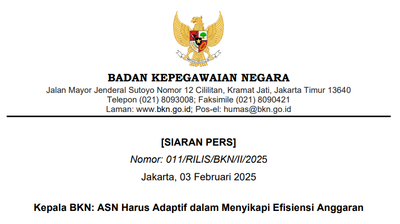 Kepala Badan Kepegawaian Negara (BKN) Prof. Zudan Arif menyampaikan bahwa untuk menyikapi efisiensi anggaran sesuai instruksi Presiden, seluruh ASN harus adaptif dalam menjalankan tugas dan mampu bekerja dengan efektif serta efisien. “Efisiensi anggaran ini merupakan pintu pembuka yang bisa dijadikan kesempatan emas bagi para ASN dalam menerapkan sistem kerja yang lebih modern dengan terus menyempurnakan digitalisasi birokrasi yang lebih baik,” imbau Kepala BKN di tengah arahan Apel Pagi secara daring, Senin (03/02/2025) di BKN Pusat, Jakarta. Arahan ini juga sesuai Instruksi Presiden (Inpres) Nomor 1 Tahun 2025 tentang Efisiensi Belanja dalam Pelaksanaan APBN dan APBD Tahun Anggaran 2025.
