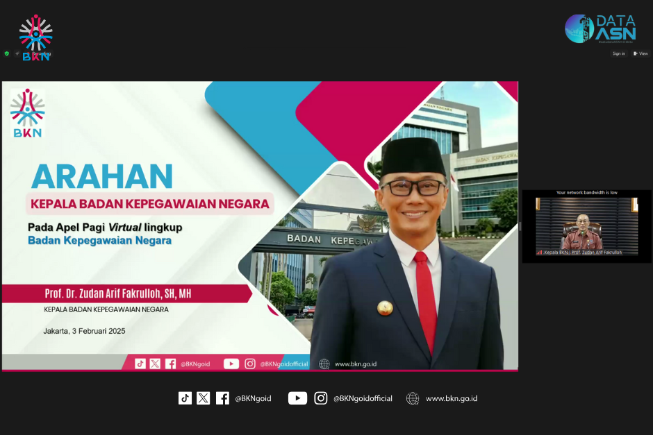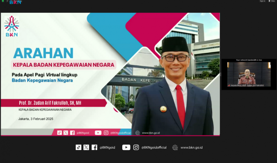 Jakarta – Humas BKN, Kepala Badan Kepegawaian Negara (BKN) Prof. Zudan Arif menyampaikan bahwa untuk menyikapi efisiensi anggaran sesuai instruksi Presiden, seluruh ASN harus adaptif dalam menjalankan tugas dan mampu bekerja dengan efektif serta efisien. “Efisiensi anggaran ini merupakan pintu pembuka yang bisa dijadikan kesempatan emas bagi para ASN dalam menerapkan sistem kerja yang lebih modern dengan terus menyempurnakan digitalisasi birokrasi yang lebih baik,” imbau Kepala BKN di tengah arahan Apel Pagi secara daring, Senin (03/02/2025) di BKN Pusat, Jakarta. Arahan ini juga sesuai Instruksi Presiden (Inpres) Nomor 1 Tahun 2025 tentang Efisiensi Belanja dalam Pelaksanaan APBN dan APBD Tahun Anggaran 2025.
