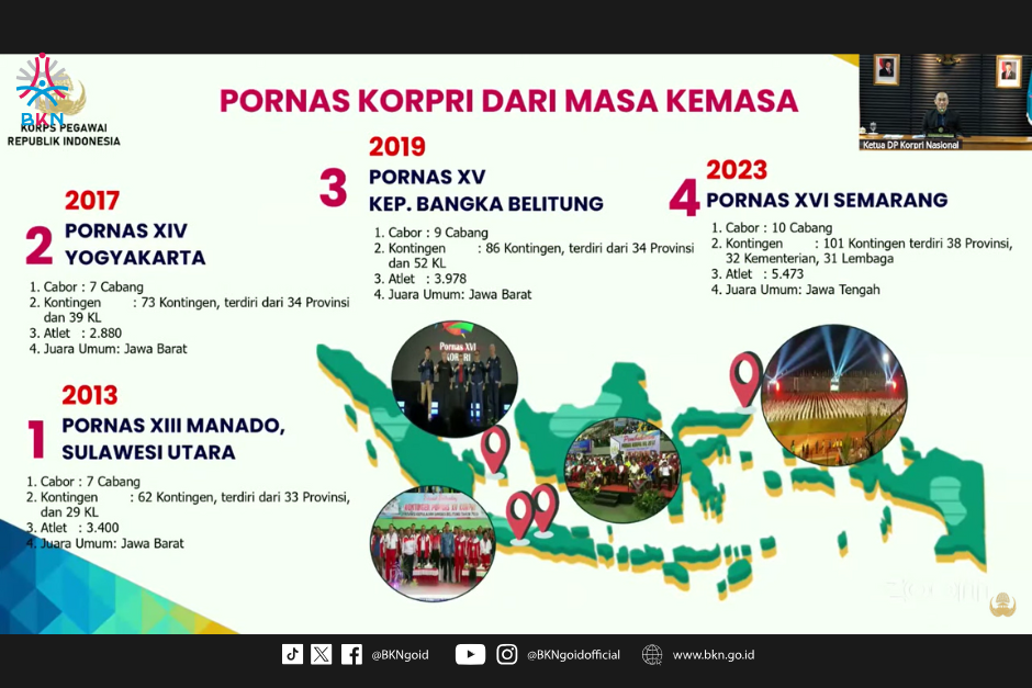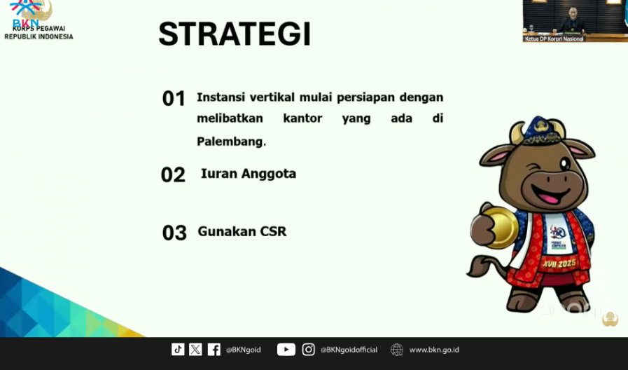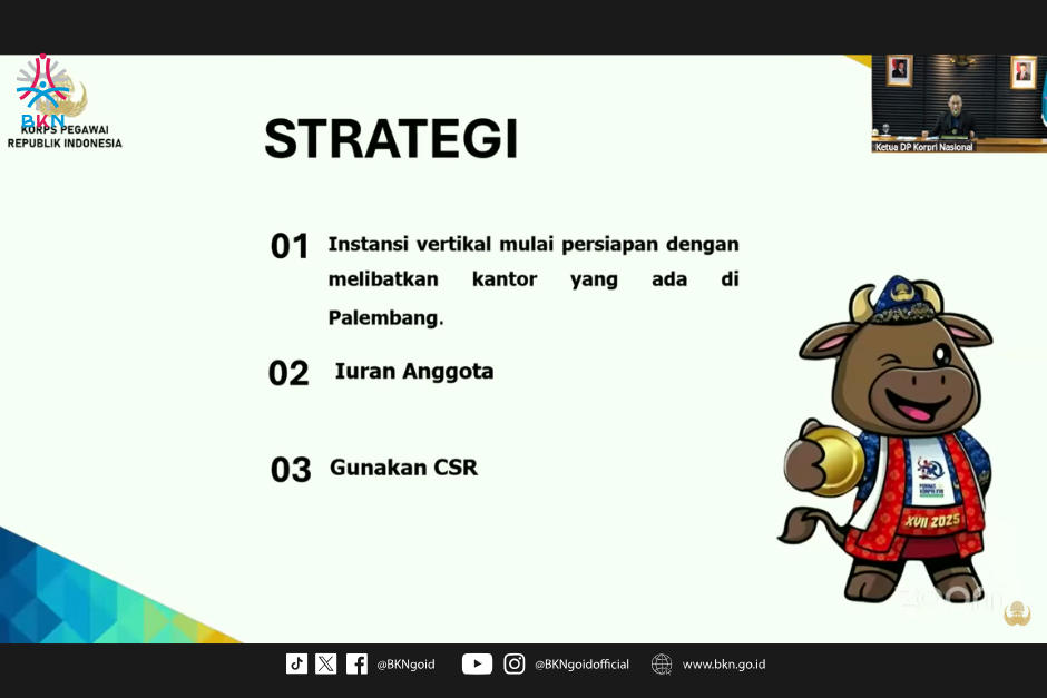 Jakarta – Humas BKN, Saat membuka Webinar Ke-110 KORPRI Menyapa ASN dengan tema “Ayo ASN siapkan PORNAS KORPRI Palembang” pada Selasa (06/05/2025) secara daring, Kepala Badan Kepegawaian Negara (BKN) sekaligus Ketua Umum Dewan Pengurus KORPRI Nasional, Prof. Zudan Arif Fakrulloh mengajak para ASN ikut menyukseskan Pekan Olahraga Nasional (PORNAS) KORPRI XVII yang akan digelar di Palembang pada Oktober 2025 mendatang dengan beberapa strategi kunci.