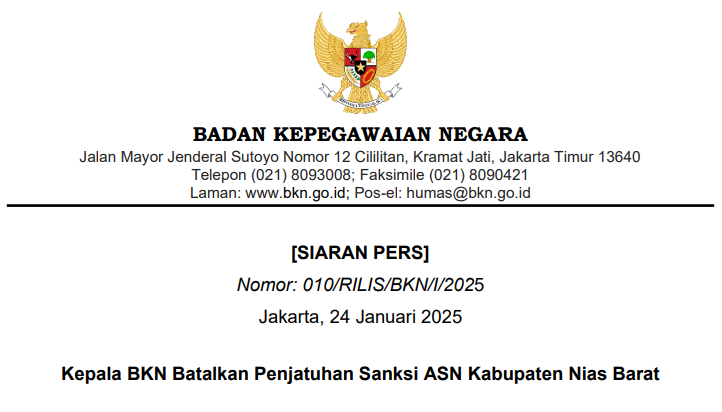 Kepala Badan Kepegawaian Negara (BKN) Prof. Zudan Arif membatalkan penjatuhan sanksi kepada 31 Aparatur Sipil Negara (ASN) di Kabupaten Nias Barat. Pembatalan ini dilakukan sebagai bentuk pengawasan dan pengendalian BKN terhadap implementasi manajemen ASN sesuai Norma, Standar, Prosedur dan Kriteria (NSPK).
