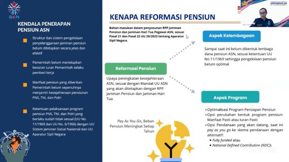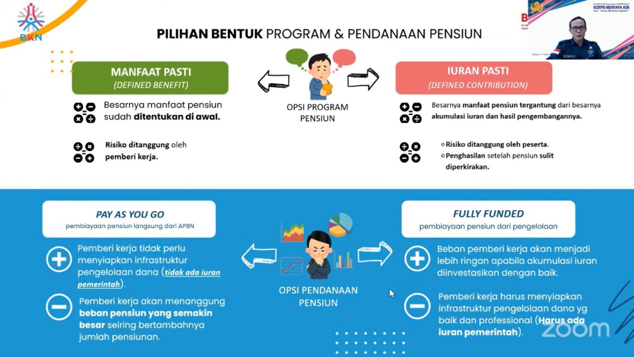 Lebih lanjut, pada webinar ini juga mengulas beberapa aspek penting dalam program dan pendanaan pensiun yang sedang diupayakan pemerintah, antara lain: Optimalisasi Program Persiapan Pensiun, Opsi Perubahan Bentuk Program Pensiun dan Opsi Pendanaan.