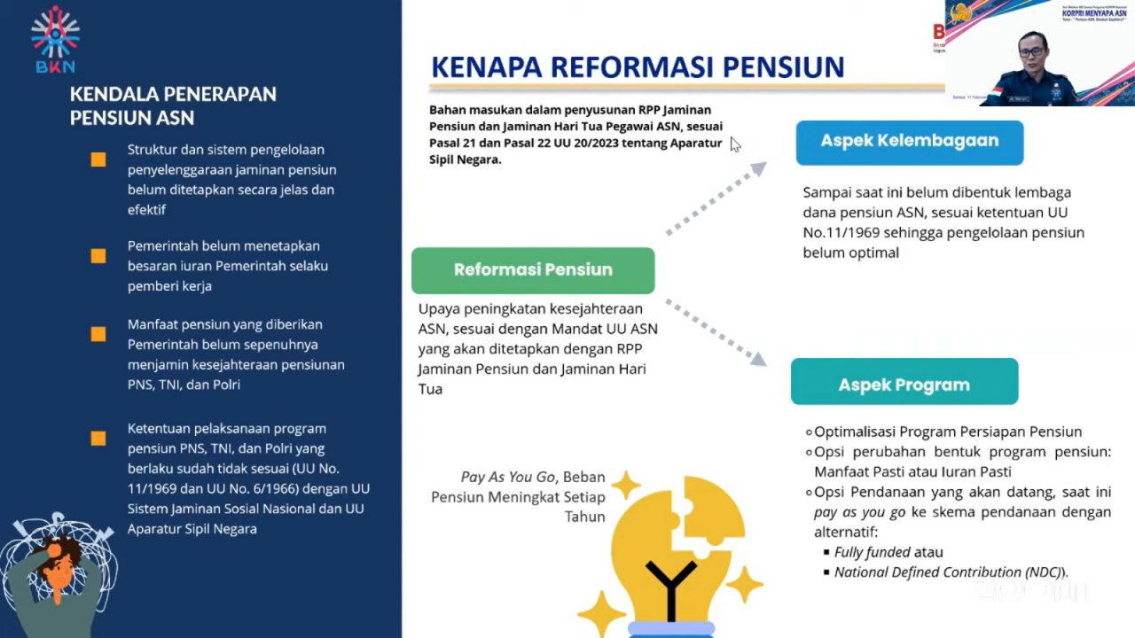 Deputi Bidang Penyelenggaraan Layananan Manajemen ASN BKN Aris Windiyanto menyatakan bahwa reformasi sistem pensiun ini bukanlah hal baru. Ia juga menjelaskan bahwa usulan perubahan sistem pensiun telah diajukan sejak 20 tahun lalu. Menurutnya Reformasi ini sejalan dengan Undang-Undang Nomor 20 Tahun 2023 tentang ASN yang mengamanatkan reformasi pengelolaan kinerja dan kesejahteraan ASN. “Kami berupaya membentuk Lembaga Dana Pensiun untuk mengoptimalkan pengelolaan dana pensiun,” terang Aris.