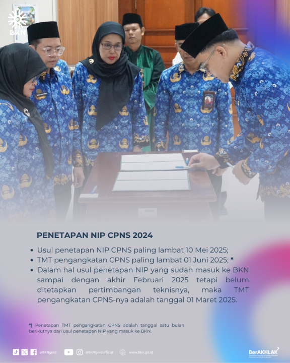 Melalui surat Kepala BKN tersebut diatur bahwa proses pengangkatan CPNS dan PPPK hasil seleksi T.A 2024 yang belum ditetapkan Nomor Induk-nya, tetap dilanjutkan sampai keputusan pengangkatan diterbitkan. Dalam hal proses pengangkatan CPNS, peserta seleksi CPNS yang dinyatakan lulus dan memenuhi syarat akan diangkat menjadi CPNS paling lambat Terhitung Mulai Tanggal (TMT) 01 Juni 2025, dan usul penetapan NIP CPNS paling lambat 10 Mei 2025. Adapun penetapan TMT pengangkatan CPNS adalah satu bulan berikutnya dari usul penetapan NIP yang masuk ke BKN. Dalam hal usul penetapan NIP yang sudah masuk ke BKN sampai dengan akhir Februari 2025 tetapi belum ditetapkan pertimbangan teknisnya, maka TMT pengangkatan CPNS-nya adalah tanggal 01 Maret 2025.