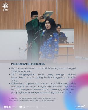 Sementara untuk peserta seleksi PPPK yang mengisi alokasi kebutuhan T.A 2024 diangkat menjadi PPPK dan melaksanakan perjanjian kerja paling lambat tanggal 01 Oktober 2025, dimana usul penetapan Nomor Induk PPPK paling lambat tanggal 10 September 2025. Adapun penetapan TMT pengangkatan PPPK adalah tanggal 1 (satu) bulan berikutnya dari usul penetapan Nomor Induk PPPK yang masuk BKN. Kemudian dalam hal usul penetapan Nomor Induk PPPK yang sudah masuk ke BKN sampai dengan akhir Februari 2025 tetapi belum ditetapkan pertimbangan teknisnya, maka TMT pengangkatan PPPK-nya adalah tanggal 01 Maret 2025.