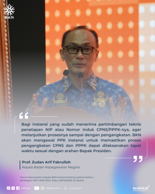 Oleh karena itu, Kepala BKN Prof. Zudan menegaskan bagi instansi yang sudah menerima pertimbangan teknis penetapan NIP CPNS atau PPPK, agar melanjutkan prosesnya sampai dengan pengangkatan dan/atau penandatanganan perjanjian kerja. Ia juga mengimbau para Pejabat Pembina Kepegawaian (PPK) di instansi pusat dan daerah untuk tetap menganggarkan gaji bagi pegawai non-ASN yang sedang mengikuti proses seleksi hingga diangkat menjadi ASN sesuai dengan Surat Menteri PANRB Nomor B/5993/M.SM.01.00/2024 tanggal 12 Desember 2024.