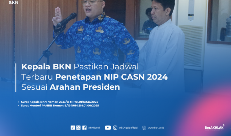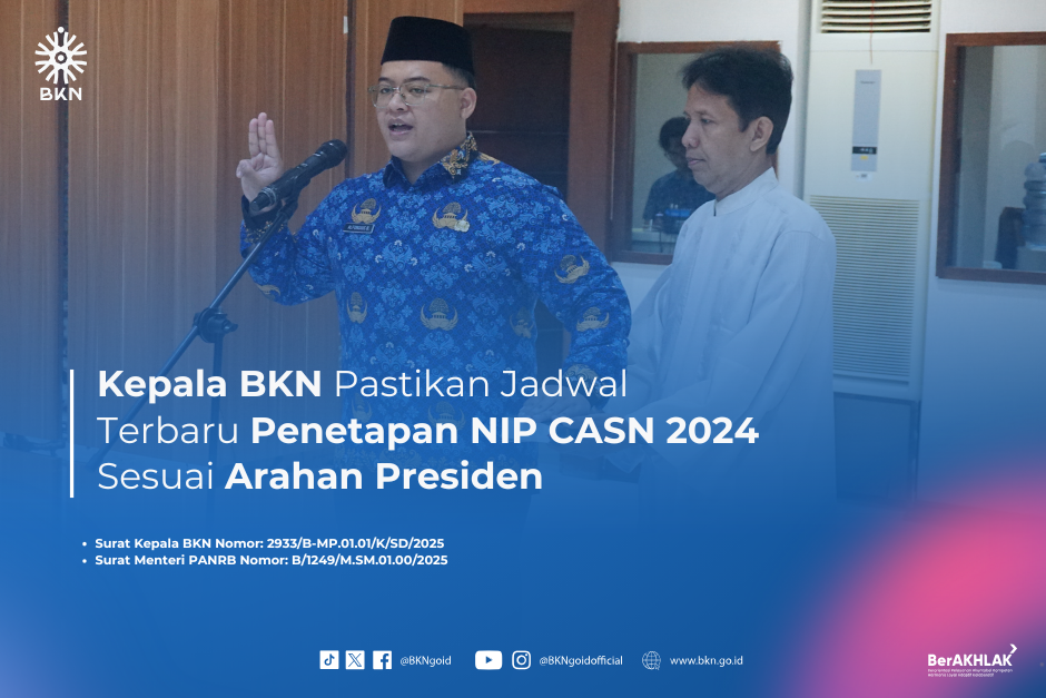 Jakarta – Humas BKN, Badan Kepegawaian Negara (BKN) kembali menerbitkan jadwal penetapan Nomor Induk atau NIP kebutuhan CASN T.A 2024 untuk menindaklanjuti arahan Presiden RI melalui Menteri Sekretaris Negara. Jadwal terbaru penetapan NIP CASN ini telah disampaikan kepada seluruh instansi pusat dan daerah melalui Surat Kepala BKN Nomor: 2933/B-MP.01.01/K/SD/2025 tentang Penetapan Nomor Induk ASN kebutuhan Tahun Anggaran 2024. Kelanjutan proses penetapan usul NIP dan TMT hingga pengangkatan CASN 2024 ini dilakukan sesuai dengan Surat Menteri Pendayagunaan Aparatur Negara dan Reformasi Birokrasi Nomor: B/1249/M.SM.01.00/2025.