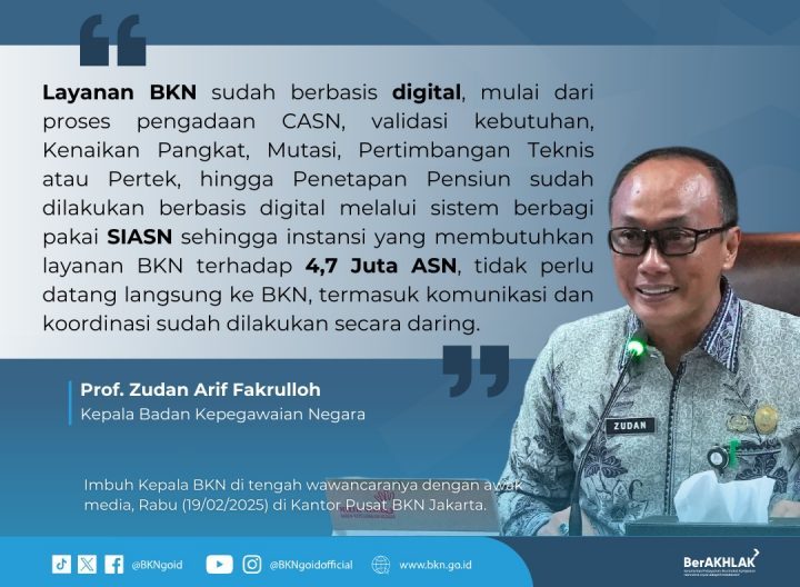 Selain itu, Ia menyampaikan kalau penerapan WFA di BKN akan tetap diikuti dengan pemantauan kinerja harian berbasis sistem yang dirancang untuk mengevaluasi apakah target kerja setiap pegawai tercapai atau tidak secara periodik. Terlebih layanan manajemen ASN di BKN sendiri sudah berbasis digital, mulai dari proses pengadaan ASN seperti penetapan NIP CPNS/PPPK, validasi formasi kebutuhan pegawai, penetapan Kenaikan Pangkat, status, mutasi, penerbitan Pertimbangan Teknis atau Pertek, hingga Pensiun sudah dilakukan melalui SIASN – sistem pengelolaan ASN berbagi pakai antara BKN dengan seluruh instansi.