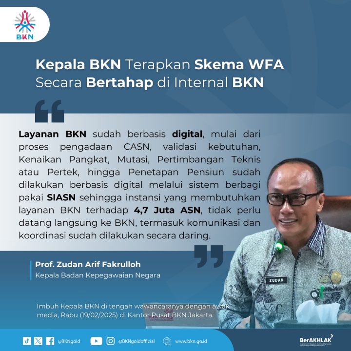 Prof. Zudan juga menjelaskan unit-unit yang melayani pengelolaan administrasi manajemen ASN seperti BKN dapat lebih mudah melakukan sistem WFA. Untuk BKN sendiri rencananya baru akan memulai penerapan WFA ini mulai pekan depan secara bertahap diikuti dengan evaluasi secara berkala.