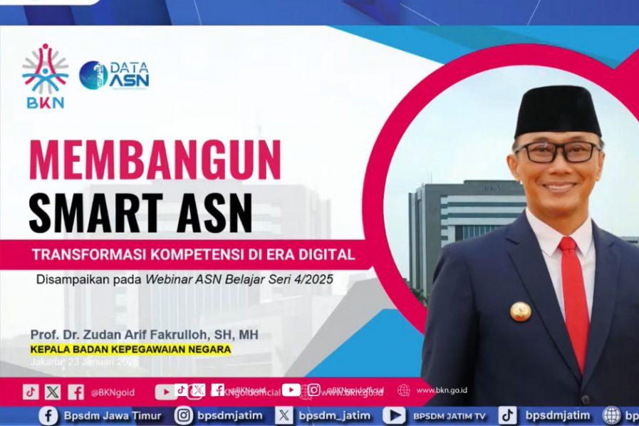 Jakarta – Humas BKN, Saat menjadi pembicara utama dalam Webinar ASN Belajar, Kamis (30/01/2025), Kepala Badan Kepegawaian Negara (BKN) Prof. Zudan Arif menekankan pentingnya transformasi kompetensi ASN di era digital untuk membangun smart ASN. Ini merupakan langkah strategis untuk mempersiapkan manajemen talenta guna mewujudkan Asta Cita yang dicanangkan oleh Presiden Prabowo dan Wakil Presiden Gibran.
