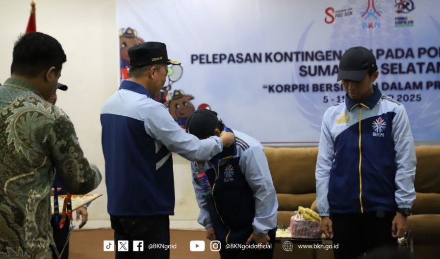 Palembang – Humas BKN, Dalam Pekan Olahraga Nasional (Pornas) Korpri XVII Tahun 2025, Badan Kepegawaian Negara (BKN) mengirimkan kontingennya untuk perhelatan akbar Korpri tersebut. Sebelum kompetisi dimulai, Kepala BKN sekaligus Ketua Dewan Pengurus Korpri Nasional, Prof. Zudan secara resmi melepas dan memberikan pengarahan terhadap Kontingen BKN yang akan berlaga pada Pornas Korpri tahun ini di Palembang, Minggu (05/10/2025) yang berlangsung di Aula Kantor Regional VII BKN Palembang.