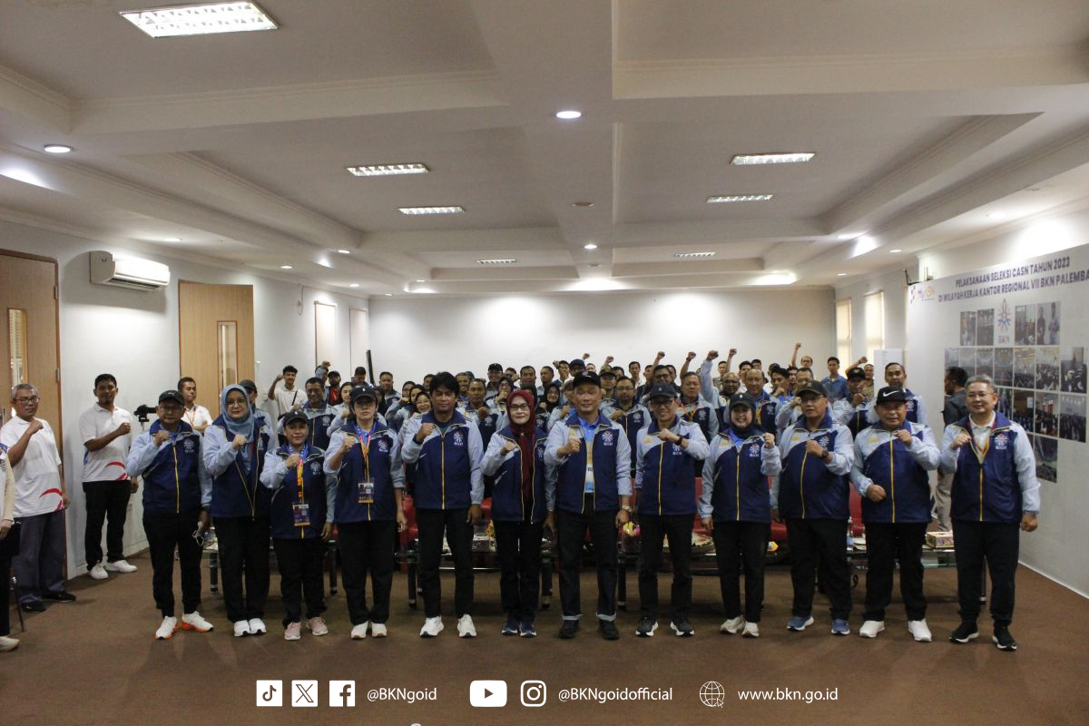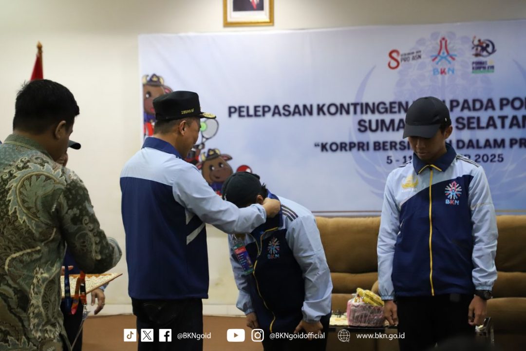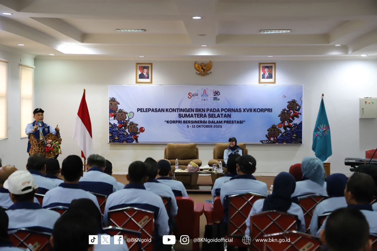Palembang – Humas BKN, Dalam Pekan Olahraga Nasional (Pornas) Korpri XVII Tahun 2025, Badan Kepegawaian Negara (BKN) mengirimkan kontingennya untuk perhelatan akbar Korpri tersebut. Sebelum kompetisi dimulai, Kepala BKN sekaligus Ketua Dewan Pengurus Korpri Nasional, Prof. Zudan secara resmi melepas dan memberikan pengarahan terhadap Kontingen BKN yang akan berlaga pada Pornas Korpri tahun ini di Palembang, Minggu (05/10/2025) yang berlangsung di Aula Kantor Regional VII BKN Palembang.