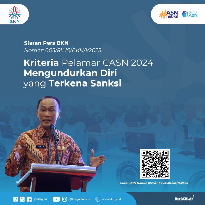 Sebaliknya, jika proses pengunduran diri tidak dilakukan sesuai prosedur yang ditetapkan tersebut maka pelamar tetap dianggap berstatus lulus dengan konsekuensi tidak dapat melakukan pendaftaran seleksi pengadaan ASN periode tahun anggaran selanjutnya. “Jadi pelamar CASN yang telah dinyatakan lulus tahap akhir seleksi namun ingin mengundurkan diri, untuk memperhatikan penjelasan tambahan ini agar tidak berdampak pada pendaftaran seleksi pengadaan ASN periode tahun anggaran berikutnya,” imbau Kepala BKN Prof. Zudan Arif, Selasa (21/01/2025) di Jakarta.