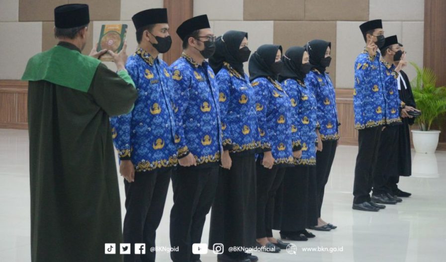 Jakarta – Humas BKN, Plt. Kepala BKN Bima Haria Wibisana melakukan pengambilan sumpah Calon Pegawai Negeri Sipil (CPNS) menjadi Pegawai Negeri Sipil (PNS) terhadap 8 (delapan) orang pegawai yang ditempatkan di lingkungan Kantor Regional (Kanreg) V BKN Jakarta. Adapun satu di antaranya merupakan CPNS lulusan PKN STAN formasi tahun 2021.