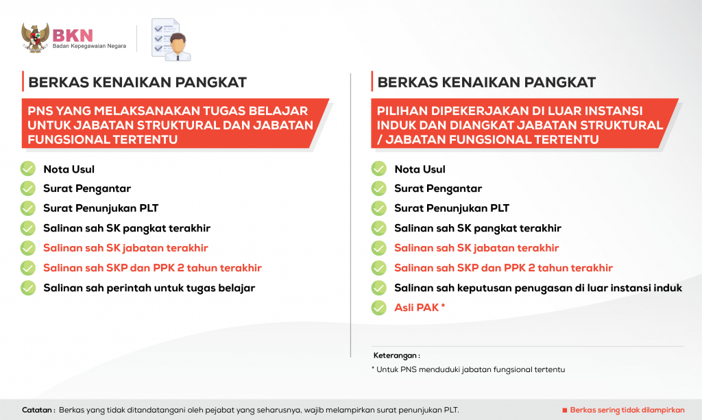 - SKP 1 tahun terakhir dengan nilai minimal Baik (bagi PNS yang dapat dipertimbangkan kenaikan pangkat pengabdian);