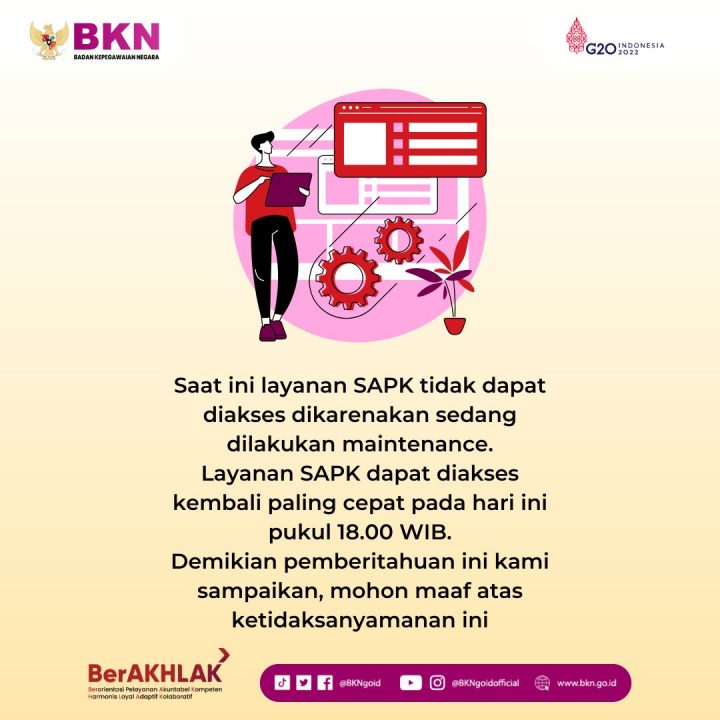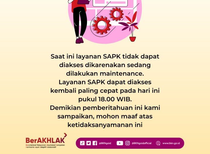 Saat ini layanan SAPK tidak dapat diakses dikarenakan sedang dalam maintenance. Layanan SAPK dapat diakses kembali paling cepat pada 18.00 WIB hari ini.