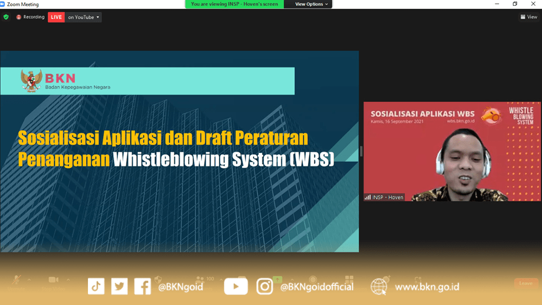 Jakarta – Humas BKN, Untuk mendukung proses pelaporan dugaan pelanggaran atau kecurangan yang berindikasi merugikan instansi dan hal-hal yang melanggar kode etik dan/atau perundang-undangan, Inspektorat Badan Kepegawaian Negara (BKN) menyelenggarakan sosialisasi aplikasi WBS BKN, Kamis (16/09/2021) secara virtual. Whistle Blowing System (WBS) sendiri merupakan sistem yang disediakan oleh Inspektorat BKN untuk publik yang memiliki informasi dan ingin melaporkan suatu perbuatan yang memiliki indikasi pelanggaran yang terjadi di lingkungan BKN.