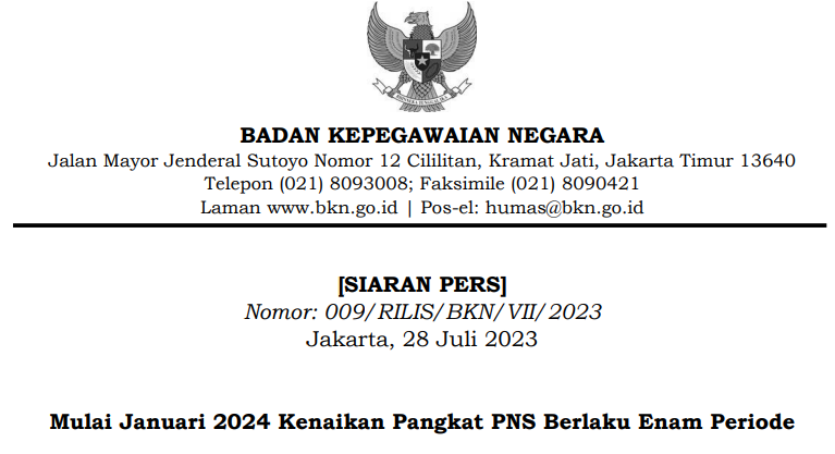 Selengkapnya ketentuan terbaru Kenaikan Pangkat PNS ini dapat diunduh pada https://www.bkn.go.id/unggahan/2023/07/Peraturan-BKN-4-Tahun-2023-Periodisasi-Kenaikan-Pangkat-Pegawai-Negeri-Sipil.pdf.