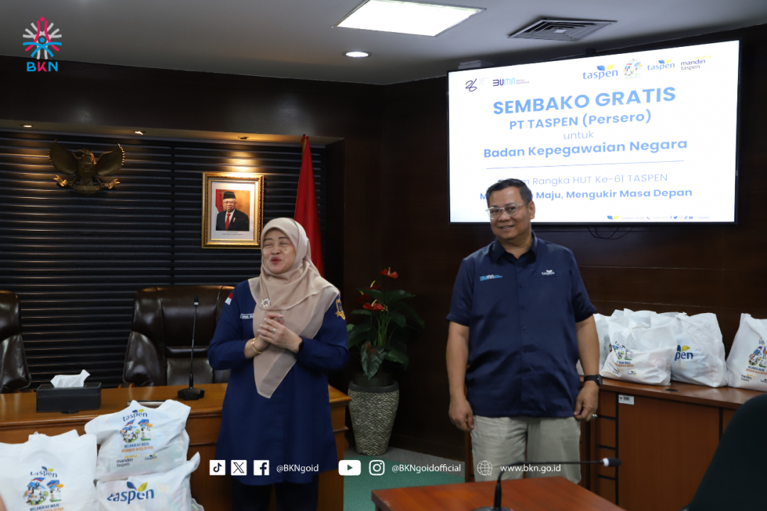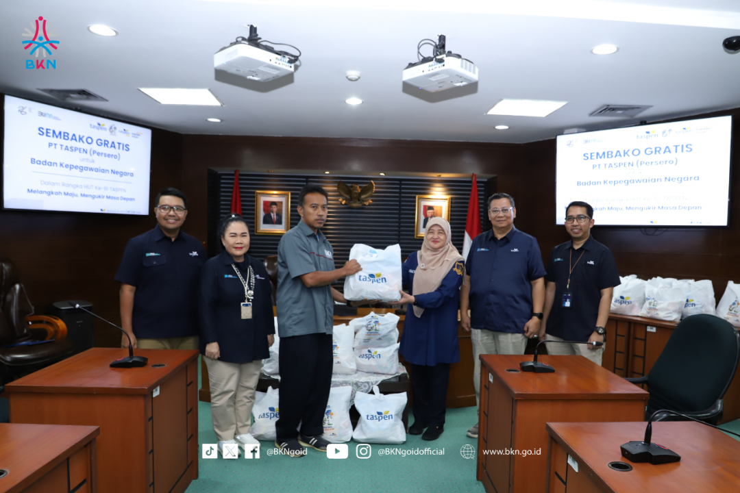 Penyerahan paket sembako gratis dalam rangka HUT Taspen ke-61 tersebut diserahkan oleh Direktur Operasional PT Taspen Persero Ariandi, Selasa (02/4/2024) di Kantor Pusat BKN Jakarta. Inisiasi penyerahan paket sembako gratis bagi PPNPN di BKN ini mendapat sambutan baik dari Sekretaris Utama BKN Imas Sukmariah.