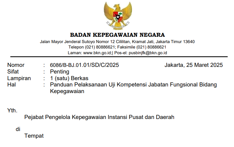 Dalam rangka menindaklanjuti surat Kepala Badan Kepegawaian Negara Nomor 2786/B-BJ.01.01/SD/K/2025 Tanggal 07 Maret 2025 Hal Uji Kompetensi Jabatan Fungsional Bidang Kepegawaian yang semula 4 (empat) kali menjadi 12 (dua belas) kali atau setiap bulan dalam satu tahun disampaikan beberapa hal sebagai berikut: