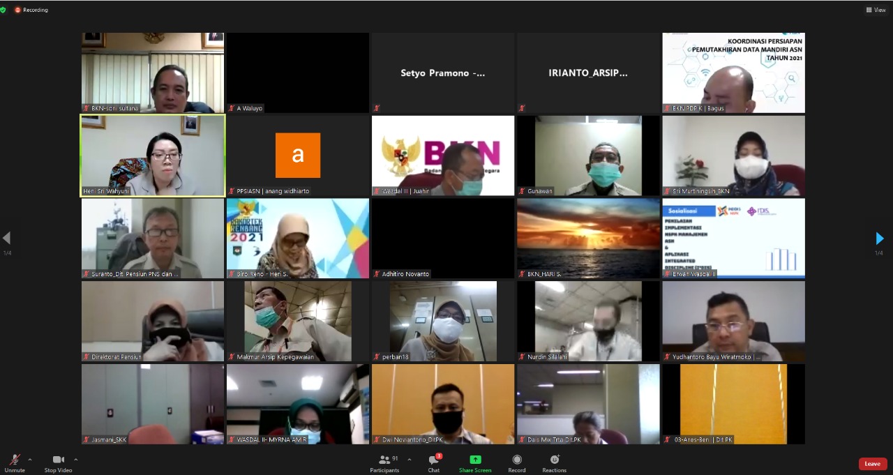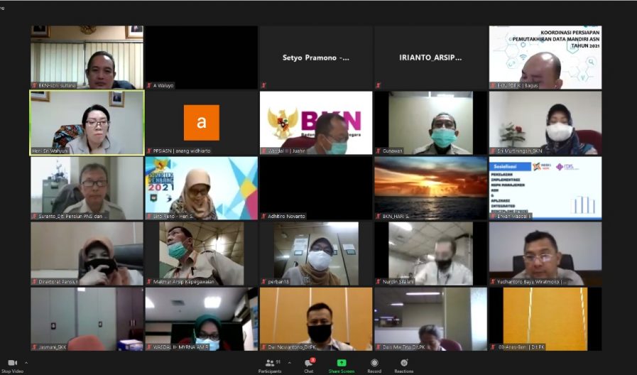 Jakarta – Humas BKN, Jelang dilaksanakannya kegiatan Pemutakhiran Data Mandiri Aparatur Sipil Negara (ASN) sebagai salah satu program yang mendukung terwujudnya Satu Data ASN, Badan Kepegawaian Negara (BKN) melakukan pematangan prosedur pada rapat koordinasi yang digelar melalui aplikasi rapat daring, Senin (8/3/2021).