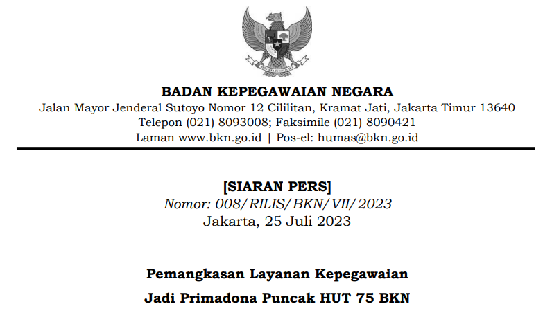 Kehadiran BKN selama puluhan tahun menjadi wujud perjalanan transformasi dan eksistensi pengelolaan pegawai ASN hingga saat ini. Bertambahnya usia BKN ke-75 pada tahun 2023 juga ditandai dengan berbagai perubahan layanan manajemen ASN dari masa ke masa. Perubahan layanan manajemen ASN terutama menyangkut pemangkasan layanan kepegawaian mulai dari Sistem Pengadaan CASN sampai dengan Pensiun dipamerkan dalam momen Puncak Hari Ulang Tahun (HUT) 75 BKN yang digelar pada Selasa, (21/7/2023) di Kantor Pusat BKN Jakarta.