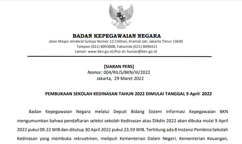 Badan Kepegawaian Negara melalui Deputi Bidang Sistem Informasi Kepegawaian BKN mengumumkan bahwa pendaftaran seleksi sekolah Kedinasan atau Dikdin 2022 akan dibuka mulai 9 April 2022 pukul 09.22 WIB dan ditutup 30 April 2022 pukul 23.59 WIB. Terhitung ada 8 Instansi Pembina Sekolah