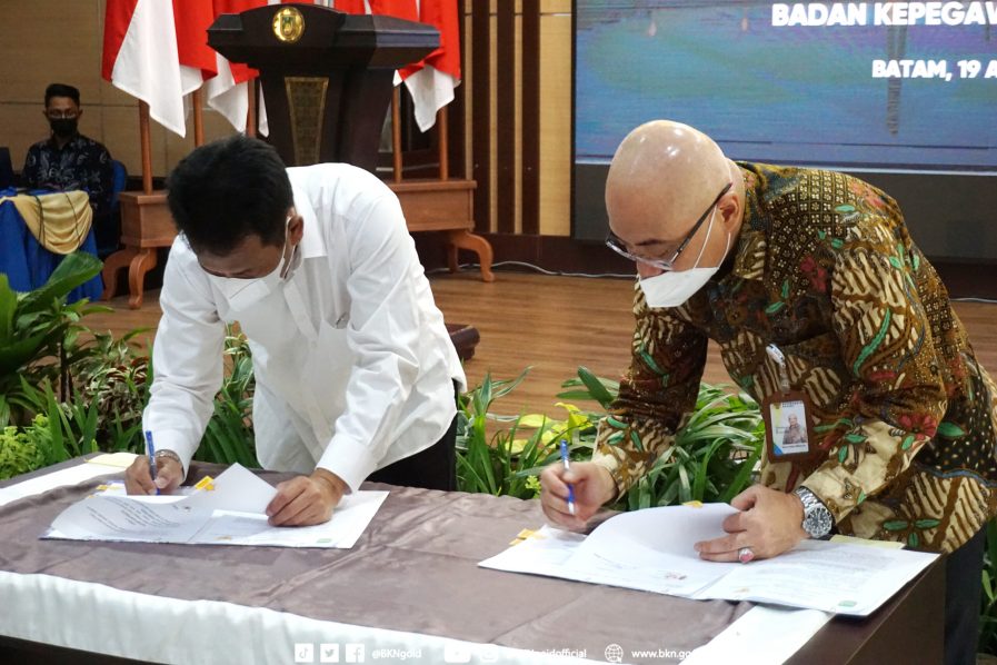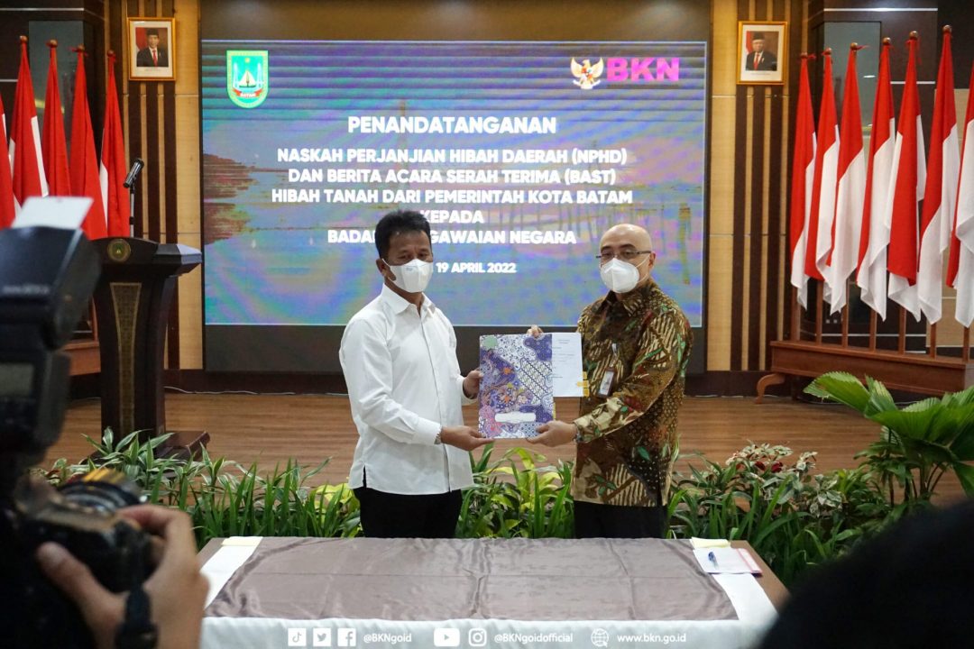 Batam – Humas BKN, Plt. Kepala Badan Kepegawaian Negara (BKN), Bima Haria Wibisana bersama Walikota Batam, Muhammad Rudi melakukan penandatanganan Naskah Perjanjian Hibah Daerah (NPHD) dan Berita Acara Serah Terima (BAST) Hibah Tanah dari Pemerintah Kota Batam kepada BKN, Selasa (19/4/2022) di Kantor Walikota Batam.