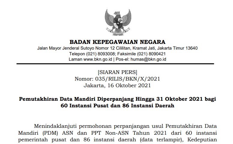 Pemutakhiran Data Mandiri Diperpanjang Hingga 31 Oktober 2021 bagi 60 Instansi Pusat dan 86 Instansi Daerah 16/10/2021 Publikasi, Siaran Pers 16/10/2021 – Pemutakhiran Data Mandiri Diperpanjang Hingga 31 Oktober 2021 bagi 60 Instansi Pusat dan 86 Instansi Daerah Bagikan tentang ini Tweet Share Share Email Pin It Publikasi Lainnya Pengumuman Hasil Seleksi Administrasi Uji Kompetensi Jabatan Fungsional di Bidang Manajemen ASN Periode Desember 2025 Terbukti Dorong Penguatan Tata Kelola di Daerah, Wali Kota Gorontalo Apresiasi Kebijakan BKN Pro-Karier ASN Kepala BKN Prof. Zudan Ajak Pemda Gorontalo Selaraskan Kinerja dengan Asta Cita Presiden Indeks Data ASN Tembus 99,86, BKN Nilai Pemkot Cirebon Siap Percepat Implementasi Manajemen Talenta ASN
