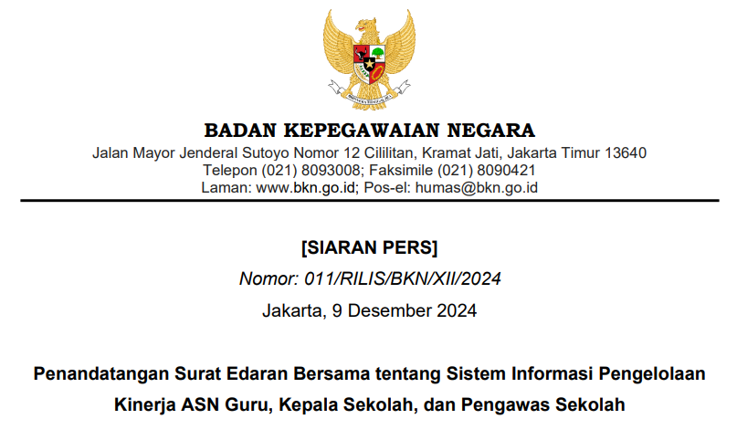 Badan Kepegawaian Negara (BKN) Bersama dengan Kementerian Pendidikan Dasar dan Menengah (Kemdikdasmen) melakukan penandatangan Surat Edaran Bersama antara Menteri Pendidikan Dasar dan Menengah serta Kepala BKN yang bertempat di Kemendidasmen Senin (9/12/2024). Surat edaran ini mengatur tentang sistem informasi pengelolaan kinerja guru, kepala sekolah, dan pengawas sekolah yang terintegrasi dengan sistem nasional. Sistem informasi pengelolaan kinerja ini dirancang untuk mendukung pengelolaan kinerja ASN sesuai dengan Peraturan Menteri PAN RB Nomor 6 Tahun 2022.