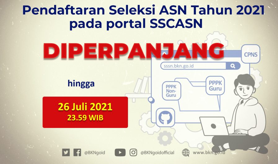 Jakarta – Humas BKN, Badan Kepegawaian Negara (BKN) selaku Ketua Pelaksana Panitia Seleksi Nasional (Panselnas) memutuskan memperpanjang waktu pendaftaran seleksi ASN 2021 di portal SSCASN BKN yang semula berakhir pada tanggal 21 Juli 2021 menjadi 26 Juli 2021 pukul 23:59 WIB. Perubahan jadwal tersebut disampaikan kepada seluruh Pejabat Pembina Kepegawaian (PPK) Kementerian/Lembaga dan Pemerintah Daerah melalui Surat BKN Nomor 6201/B-KS.04.01/SD/K/2021 tanggal 19 Juli 2021 perihal Penyesuaian Jadwal Tahapan Pelaksanaan Seleksi Calon ASN Tahun 2021.