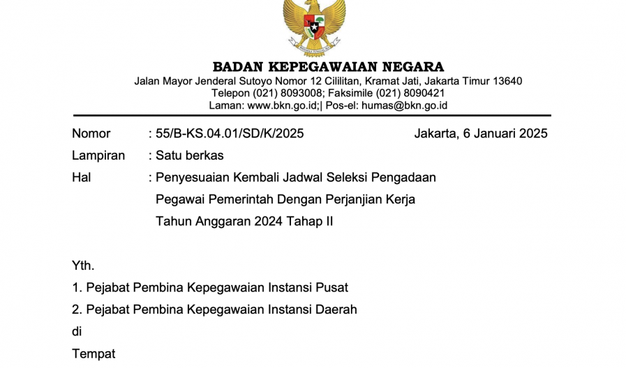 Jakarta – Humas BKN, Pemerintah melalui Badan Kepegawaian Negara (BKN) kembali memperpanjang waktu pendaftaran seleksi Pegawai Pemerintah dengan Perjanjian Kerja (PPPK) Tahap 2. Aturan tersebut tertuang melalui Surat Kepala BKN Nomor 55/B-KS.04.01/SD/K/2025 tanggal 6 Januari 2025 perihal Penyesuaian Kembali Jadwal Seleksi Pengadaan Pegawai Pemerintah Dengan Perjanjian Kerja Tahun Anggaran 2024 Tahap 2.