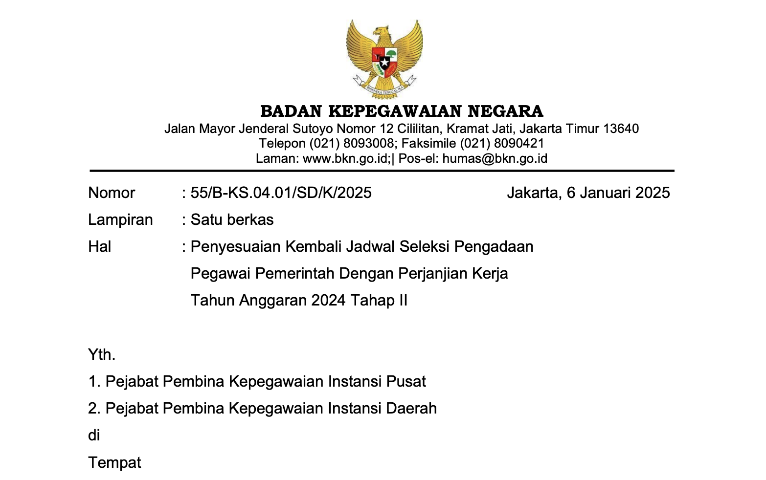 Jakarta – Humas BKN, Pemerintah melalui Badan Kepegawaian Negara (BKN) kembali memperpanjang waktu pendaftaran seleksi Pegawai Pemerintah dengan Perjanjian Kerja (PPPK) Tahap 2. Aturan tersebut tertuang melalui Surat Kepala BKN Nomor 55/B-KS.04.01/SD/K/2025 tanggal 6 Januari 2025 perihal Penyesuaian Kembali Jadwal Seleksi Pengadaan Pegawai Pemerintah Dengan Perjanjian Kerja Tahun Anggaran 2024 Tahap 2.