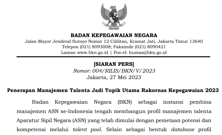 Persiapan penerapan manajemen talenta ASN di seluruh instansi pemerintah ini akan disampaikan kepada seluruh instansi pengelola ASN, yakni Kementerian/Lembaga/Daerah (K/L/D) melalui Rapat Koordinasi Nasional atau Rakornas Kepegawaian bertajuk “Talent Management 2030: Smart, Agile, and Empathy” yang digelar pada Selasa, 30 Mei 2023 secara hybrid. Forum ini juga sekaligus sebagai bentuk evaluasi pengelolaan manajemen kepegawaian nasional.