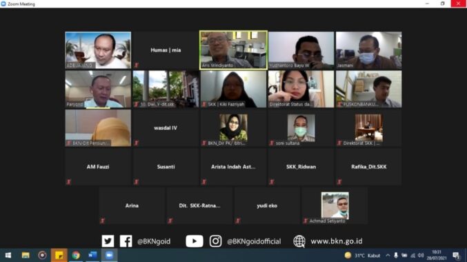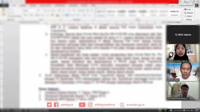 Turut hadir dalam virtual meeting sidang penentuan status kepegawaian Direktur Arsip Kepegawaian Yudhantoro Bayu Wiratmoko, Direktur Pensiun PNS Sri Widayanti dan Direktur Pengadaan dan Kepangkatan Ibtri Rejeki. Selain itu, unit kerja terkait lainnya seperti dari pengawasan dan pengendalian, Puskobankum, serta Direktur Pengelolaan Data dan Penyajian Informasi Kepegawaian Soni Sultana. mia