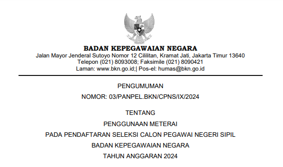 Penggunaan Meterai pada Pendaftaran Seleksi CPNS Badan Kepegawaian Negara T.A. 2024