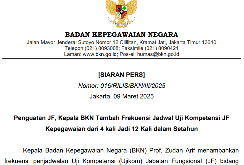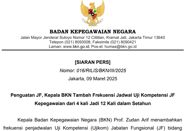 Kepala Badan Kepegawaian Negara (BKN) Prof. Zudan Arif menambahkan frekuensi penjadwalan Uji Kompetensi (Ujikom) Jabatan Fungsional (JF) bidang Kepegawaian dari sebelumnya 4 (empat) kali menjadi 12 (dua belas) kali dalam setahun. Kebijakan ini tertuang dalam Surat Kepala BKN Nomor: 2786/B-BJ.01.01/SD/K/2025 tentang Uji Kompetensi Jabatan Fungsional Bidang Kepegawaian tanggal 7 Maret 2025.