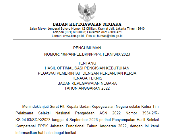 Pengumuman Hasil Optimalisasi Pengisian Kebutuhan PPPK Tenaga Teknis BKN TA 2022