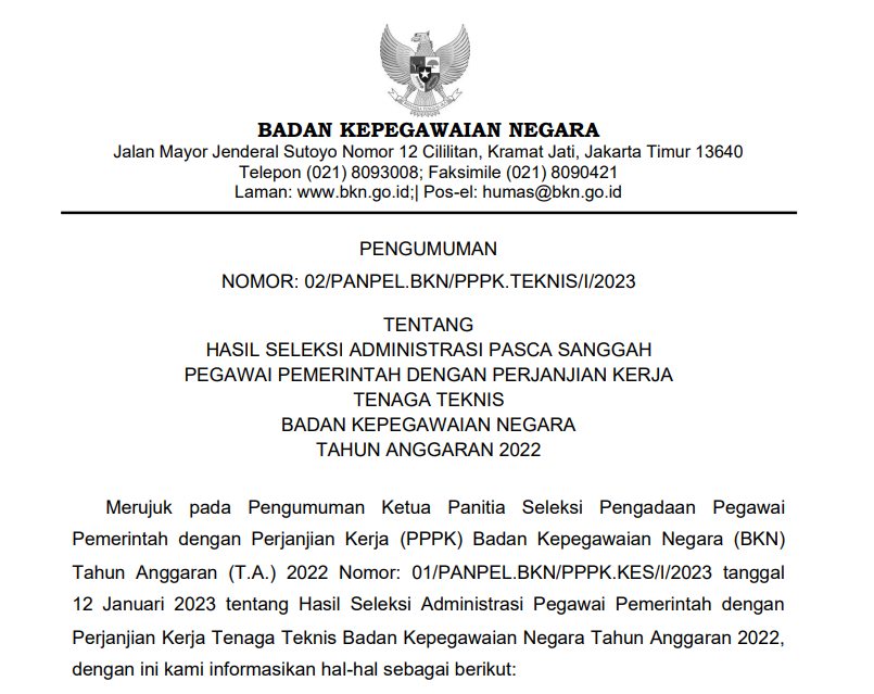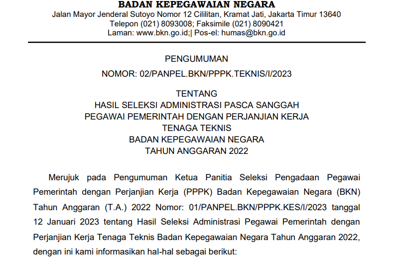 Merujuk pada Pengumuman Ketua Panitia Seleksi Pengadaan Pegawai Pemerintah dengan Perjanjian Kerja (PPPK) Badan Kepegawaian Negara (BKN) Tahun Anggaran (T.A.) 2022 Nomor: 01/PANPEL.BKN/PPPK.KES/I/2023 tanggal 12 Januari 2023 tentang Hasil Seleksi Administrasi Pegawai Pemerintah dengan Perjanjian Kerja Tenaga Teknis Badan Kepegawaian Negara Tahun Anggaran 2022, dengan ini kami informasikan hal-hal sebagaimana terlampir pada tautan berikut: