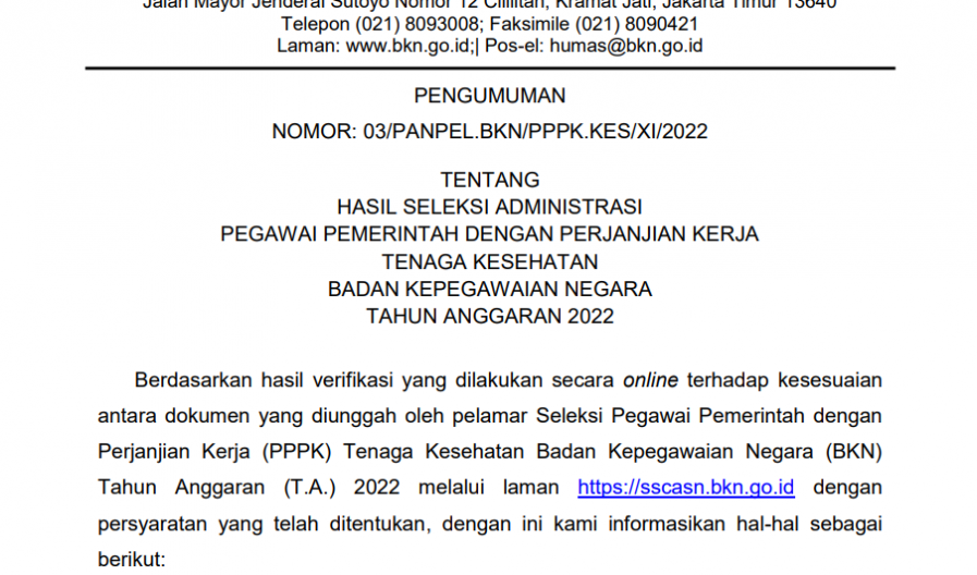 Pengumuman Hasil Seleksi Administrasi PPPK Kesehatan BKN 2022
