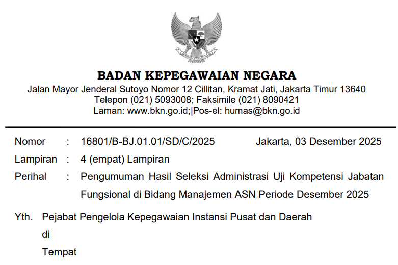 Bersama ini kami sampaikan hasil seleksi administrasi Uji Kompetensi Jabatan Fungsional di Bidang Manajemen ASN periode Desember 2025 berdasarkan verifikasi dan validasi dokumen yang dipersyaratkan sebagaimana terlampir.