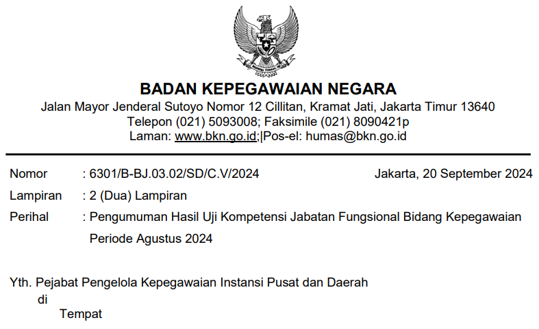 Berkenaan dengan telah dilaksanakannya Uji Kompetensi Jabatan Fungsional Bidang Kepegawaian pada tanggal 26 – 30 Agustus 2024, bersama ini kami sampaikan hal-hal sebagai berikut: