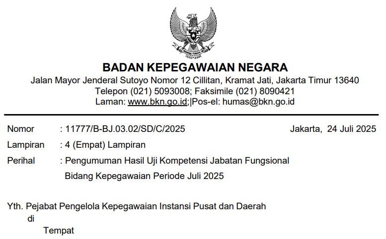 Pengumuman Hasil Uji Kompetensi Jabatan Fungsional Bidang Kepegawaian Periode Juli 2025